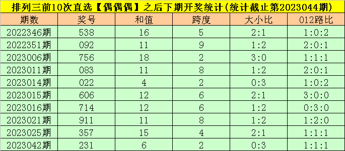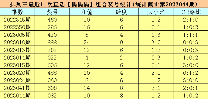 开奖总结:胪列三第2023044期开出奖号:082,类型为组六,和值为10,奇偶比为0:3,大小比为1:2,跨度为8。