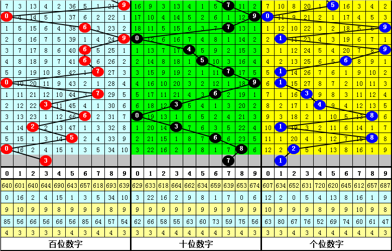 百位:近期大小号码开出比例基本特殊,上期小号出现之后,本期看好小号重叠开出;另外,该位0路和1路号码在最近20期奖号中走势较热,2路号码发扬相对较冷,本期该位舍弃2路号码,参考号码3。